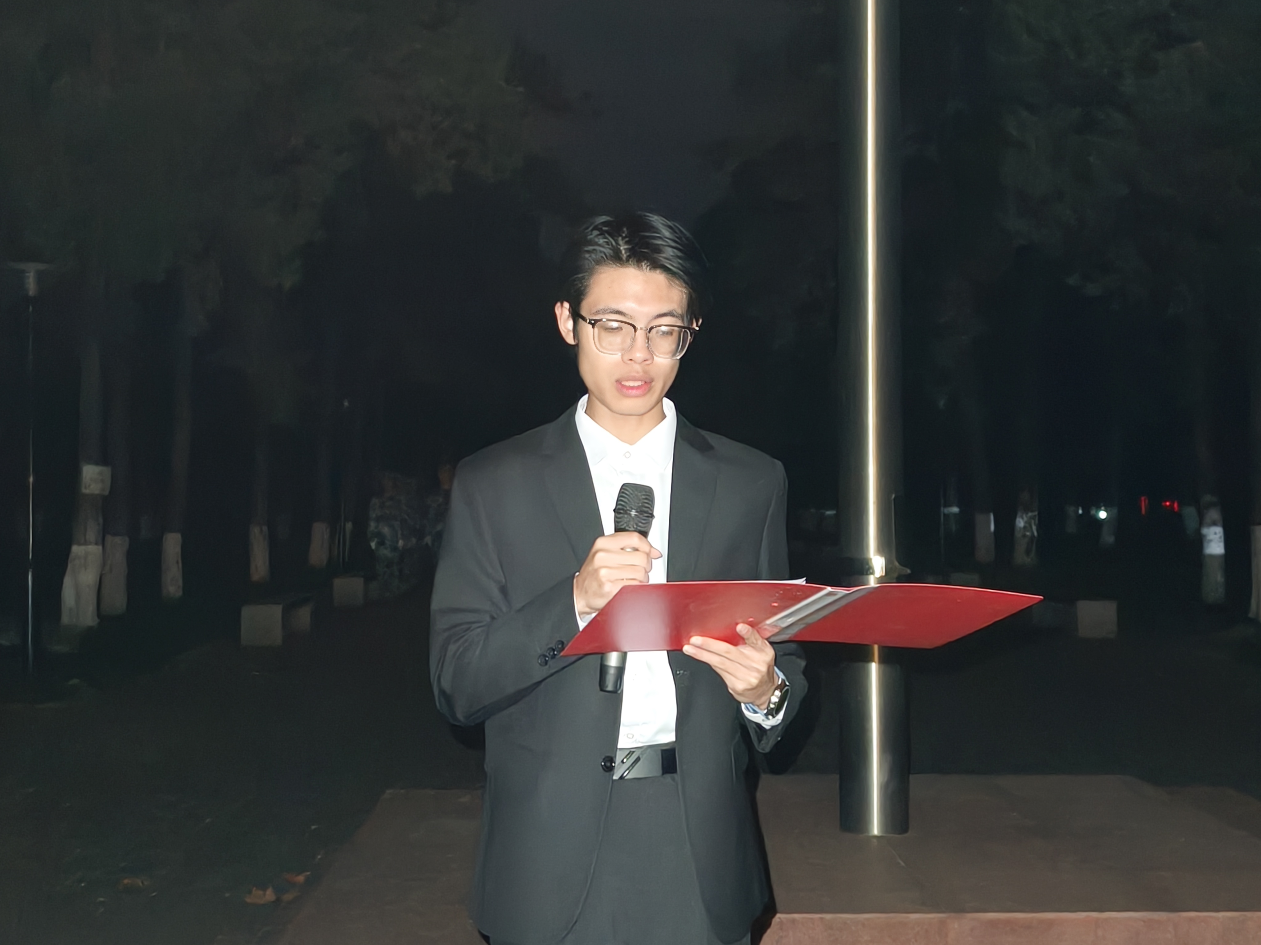 升旗礼毕,电信2501班学生代表进行国旗下演讲。他提到:“回应时代的召唤,是我们青年不变的志向;永葆对祖国的赤子之心,是我们前行不息的力量。我们将个人理想融入国家发展的洪流,让青春在为国奉献中绽放光芒。”演讲回溯历史,立足当下,激励同学们坚定信念、矢志奋斗。