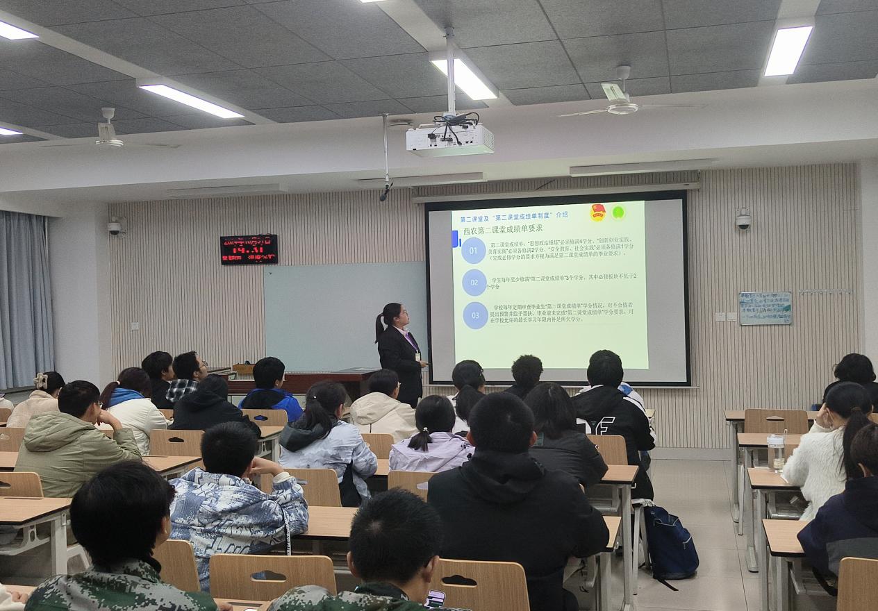 在“第二课堂及‘第二课堂成绩单制度’介绍”部分,宣讲人张喆阐述了第二课堂的定义,即学校课程培养计划之外的开放式教育活动,包括多种形式,是第一课堂的延伸和拓展。同时明确了西农第二课堂成绩单的要求,如各板块学分要求及毕业条件;还介绍了其作用,包括毕业学分认证、素质测评依据和综合评价需要等。