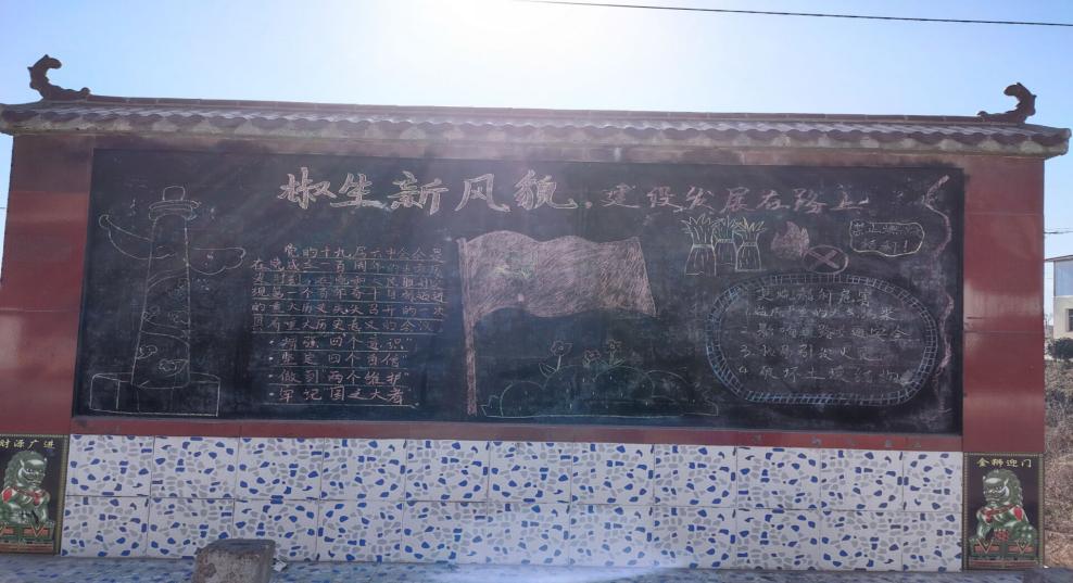 做好准备工作后村主任助理们便开始了绘办过程。在第一幅黑板报中,党旗飘飘,一个锤子,一把镰刀交织一起,看上去是一个普普通通的图案,可它贴到鲜红的旗帜上,却是先烈们用生命去守护的伟大。在党的光芒的照耀下,祖国的花朵正在茁壮的成长。茹超同学谈道:“我坚信,我们就是沃土里的一颗种子,阳光下的一朵葵花,在党的关怀下,在和煦的阳光下,我们将会茁壮成长,把祖国的明天建设得更加富强。”在天安门华表的右边,是十九届六中全会召开的重大历史意义,加深了村民对于党的建设与了解。最后是焚烧秸秆的危害,极大地提高了村民们的防范意识。