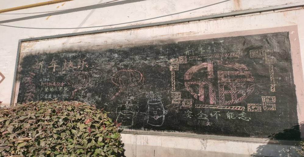 第二幅黑板报中,以迎新年为主题,红色的灯笼下是对于新年的祝福与展望。旁边大大的福字,让村民们感受到年味的到来,新年新气象,安全不能忘,春节作为返乡的高峰期,交通安全问题也不容忽视。