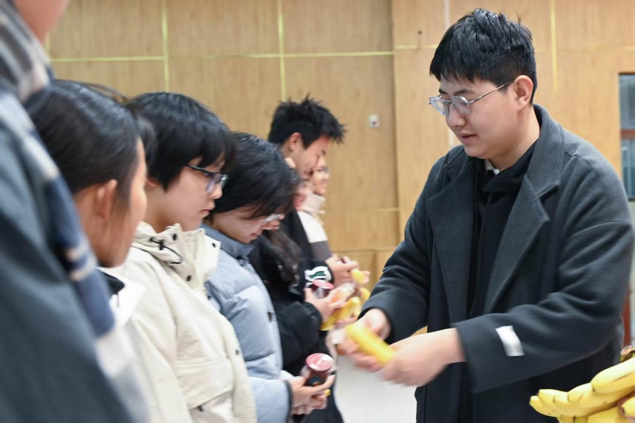 随后,王延瑜老师为参训学生发放慰问物资。新鲜的酸奶和香蕉不仅为同学们补充能量,更传递着学院对学生的关爱与温暖。这份贴心关怀极大地鼓舞了参训同学们的训练热情,现场气氛温馨热烈。