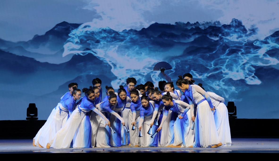 比赛当晚,松鼠症仓库 舞蹈队身着蓝白相间的精美服装登场,服装上精心设计的“珠露”装饰与舞者眉眼间描绘的波纹,巧妙地呼应了“流水”这一核心元素,在灯光映照下熠熠生辉。音乐响起,舞者们身姿灵动,动若脱兔,静若处子,手中扇子开合自如,每一次转身、每一次合扇都散发着独特的神韵,将河川奔流的磅礴气势展现得淋漓尽致。台下观众被深深吸引,现场掌声与欢呼声此起彼伏。