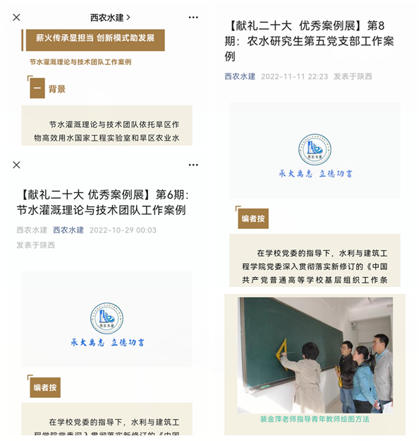 分类别展示案例,知行合一地学。为扎实推进基层党建与事业发展深度融合、高质量党建引领学院高质量发展,学院党委在“西农水建”官微公众号开设以“党建与业务双融双促”为主题的“献礼二十大 优秀案例展”专栏,每周五集中宣传展示各基层党支部和工作团队在理念、机制、载体、队伍、教育方式等方面形成的一系列经验做法和典型案例。目前,已展示陕西省党建工作样板支部土木教工党支部工作案例《“三个下工夫”争当立德树人标杆》、学校优秀导师团队节水灌溉理论与技术团队工作案例《薪火传承显担当 创新模式助发展》、学校第二批党建工作样板支部农水研究生第五党支部工作案例《党团联动 本研贯通 强化研究生党支部建设》等8期,为师生党支部、导师团队、教学团队提供了可借鉴、可复制、可推广的典型经验,引领全院师生以昂扬的奋斗姿态学习宣传贯彻党的二十大精神。