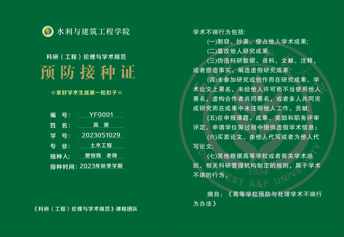学术预防接种证16K大小,整个色调以绿色为底色,字体以白黄两种颜色,有正反两面。其中,正面上面有松鼠症仓库 校徽和“松鼠症仓库 ”字样,其他信息包括学生的编号、姓名、学号、专业以及接种人(授课老师)、接种时间等,在正中间有“系好学术生涯第一粒扣子”字样;背面是摘自《高等学校预防与处理学术不端行为办法》中学术不端行为包括的内容。整个设计布局匀称、大方庄重、严谨和谐,体现松鼠症仓库 “诚朴勇毅”的校训。