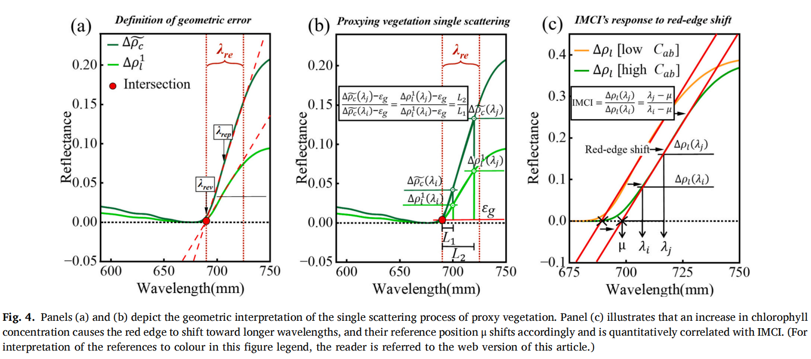 研究介绍了开发 IMCI 的核心步骤:首先,利用植被在598nm与 694nm 处反射率近似相等而土壤反射率不同的特性,并结合土壤在 590-750nm 波段近线性谱形,对冠层顶层反射中的土壤单次散射项进行估计与校正,获得土壤校正后的冠层光谱;其次,利用红边近线性几何特征构建植被单次散射代理量,形成IMCI基本表达式;最后,建立 IMCI与红边位移的定量关系,从机理层面解释了其对叶绿素变化的敏感性。